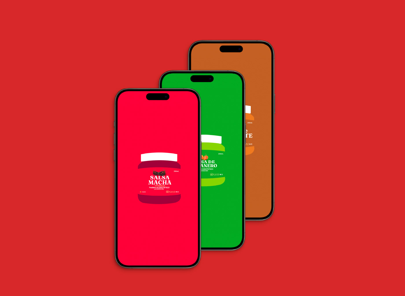 La identidad se aplica en productos como granola artesanal y salsas caseras, utilizando una paleta vibrante, tipografía clara y composiciones simples que permiten que el producto sea el protagonista.